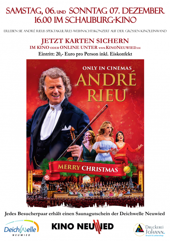 Die festliche Jahreszeit beginnt auf der großen Leinwand: Erleben Sie André Rieus Weihnachtskonzert 2025 „Merry Christmas“ als Konzertfilm im großen Schauburg-Kino. Genießen Sie die schönsten Weihnachtslieder, schwungvolle Walzer, besondere Gäste wie Emma Kok und den Klang von über 400 Bläsern – festlich, emotional und nur im Kino zu erleben.
